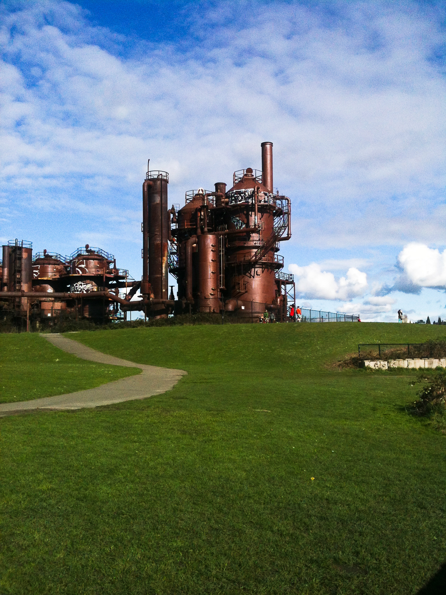 Gasworks comes into focus over the mountainside in Eastern Washington